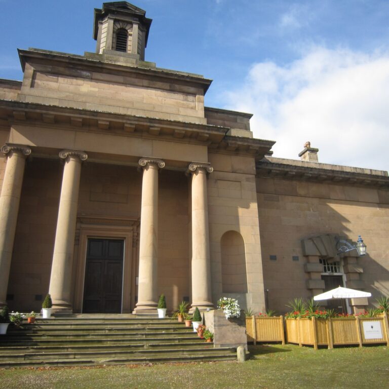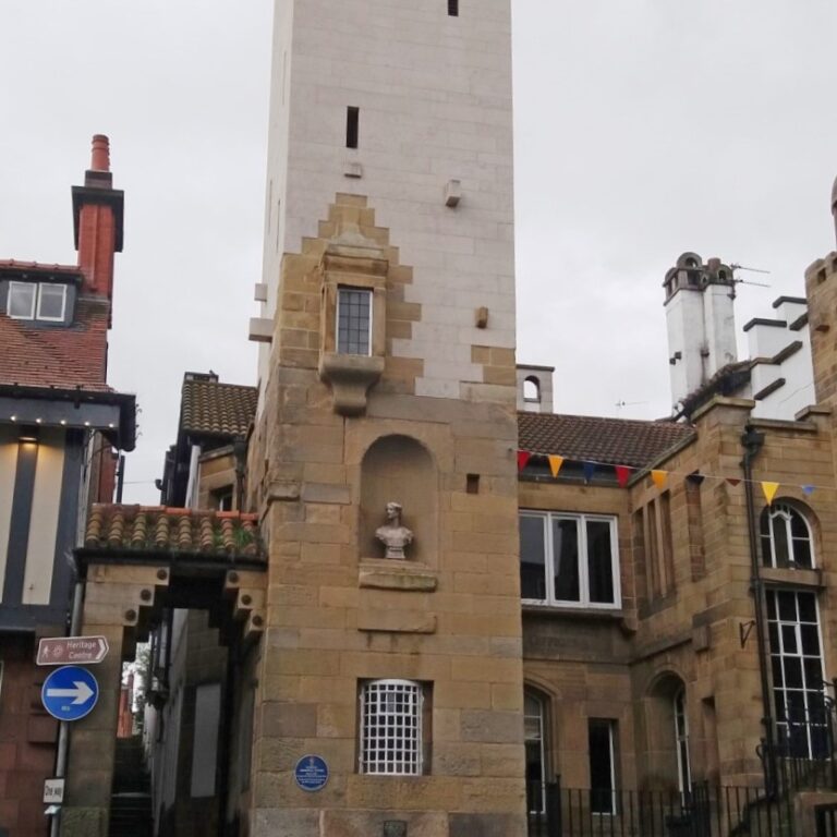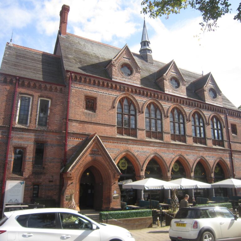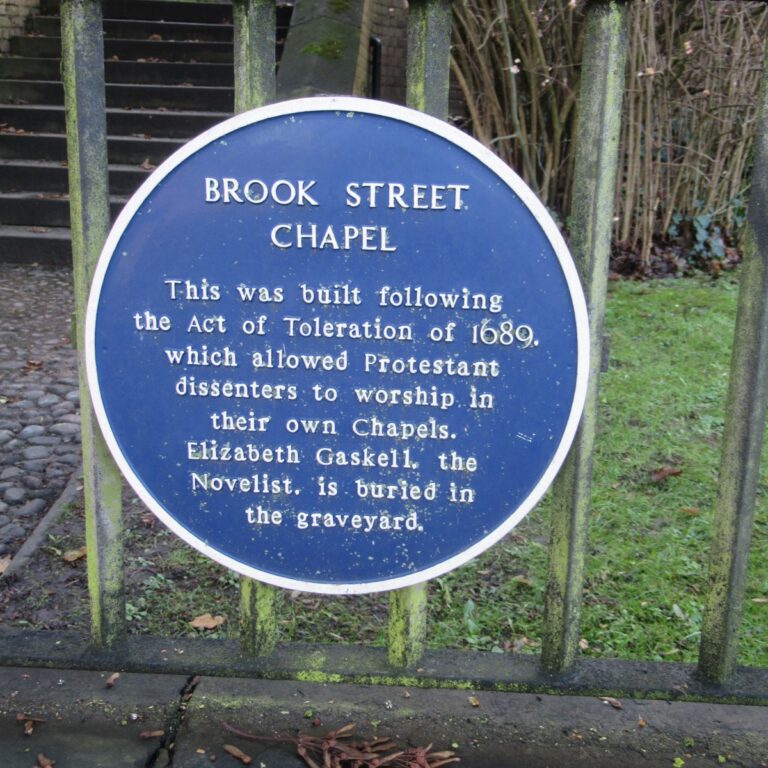 Knutsford’s genteel life has been immortalised in Cranford by the Victorian novelist, Elizabeth Gaskell who is commemorated in various parts of the town, including by a building which incorporates a number of influences, including the Arts and Crafts movement. It incorporates a stone bust of her in a niche on its street front and a bronze relief. She spent much of her early life in the town and her husband was minister for a time at the Brook Street Unitarian chapel.