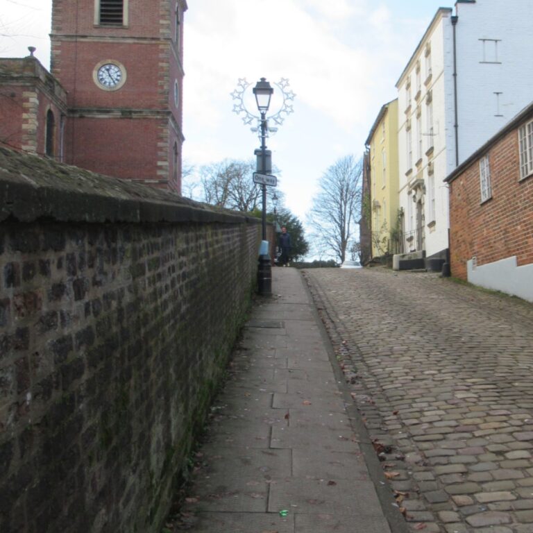 The town centre still comprises two narrow streets running almost parallel. The pavements were paid for by Lady Jane Stanley (d. 1803), daughter of the earl of Derby, and were specified by her to be the width of one flagstone. This was said to be because she wished them to be narrow to discourage men and women walking arm-in-arm. She also helped to institute the widespread use of sedan chairs in the town.