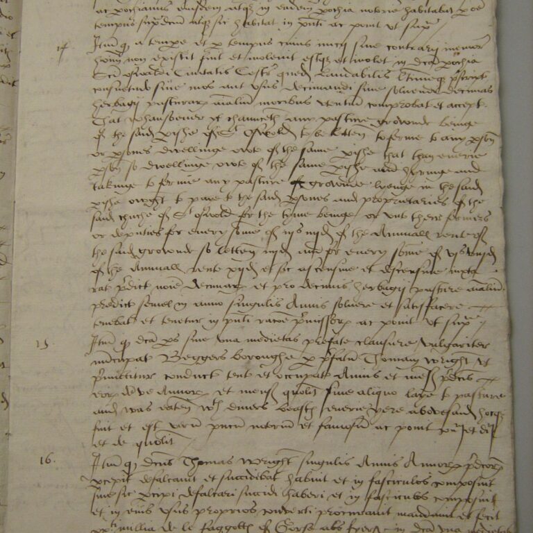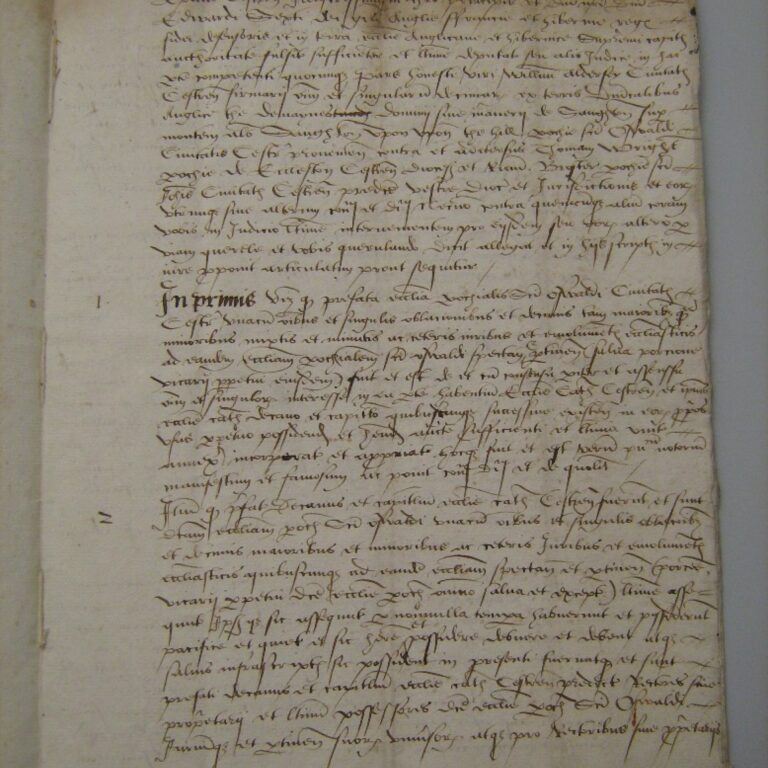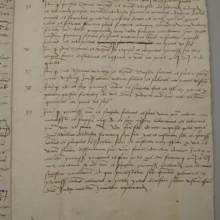 […] George Wilmesley, Bachelor of Laws, sufficiently and lawfully deputed official principal of the Chester episcopal consistory upheld by the authority of the most illustrious Prince in Christ and our master, Lord Edward the Sixth, by the grace of God King of England, France and Ireland, Defender of the Faith and on earth supreme head of the English and Irish church, or any other judge whomsoever competent in that behalf; the party of the distinguished William Aldersey of the city of Chester, farmer of all and singular tithes arising from the demesne lands, in English ‘the demaynes’, of the lordship or manor of Saughton on the Hill or ‘Saughton vpon the hill’ of the parish of Saint Oswald of Chester city against Thomas Wright of the parish of Eccleston of Chester diocese and Richard Broster of the parish of Saint John of the city of Chester aforesaid, of your diocese and jurisdiction and either or each of them jointly and severally and also against any other whomsoever lawfully intervening before you in judgement for them or either of them by way of complaint and complaining to you says, alleges and propounds in these writings in law in articles as follows: