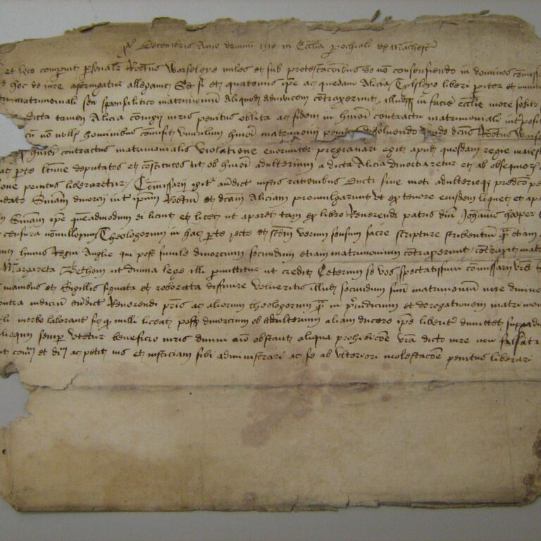 At which place and time Robert Worseleye, knight, appeared personally and under protestation of not consenting to the lord commissioners […] this he alleged that he is bound by law if and to what extent he and a certain Alice Tylsleye, free from and equally unrestricted by [….] of marriage or betrothal, contracted together any marriage, and had solemnised it in the face of the church in the usual way […] however, the said Alice, totally forgetting the law of marriage and faith placed in this marriage contract between […] committed with several men, completely dissolving this bond of matrimony […] the said Robert Worseleye […] marriage contract unlawfully oppressed by this violation, brought an action before certain of the king’s majesty’s […] lawfully deputed and constituted in this respect so that he might be divorced from the said Alice on account of this adultery and totally released from the provision of conjugal duties. Therefore, the commissioners aforesaid, lead or moved by lawful reasons and by the adultery aforesaid completely […] promulgated sentence of divorce between him, Robert, and the said Alice and from the tenor of the same it is clear and appears […] the sentence itself in what way they are allowed and he is allowed, as appears both from the book of our right reverend father John Hooper, [bishop of] Gloucester […] the opinion of several theologians, rightly and in accordance with the true sense of holy scripture written in that respect, and also by the example […] of this realm of England who, after a similar divorce, also contracted a second marriage, contracted marriage with Margaret Betham, as is permitted to him by divine law, as he believes; moreover, if you extremely well-considered commissioners […] your sentence, signed and corroborated with your hands and seal, should wish to ordain that, his second marriage, by divine law is not […] against the judgement of the aforesaid Reverend father and other theologians also to the prejudice and derogation of marriages […] they will be troubled by distress and thus it is not permitted to any man after divorce on the grounds of adultery to marry another woman, he will put away the aforesaid […] otherwise he will always act to the benefit of spirit of divine law, notwithstanding any prohibition of yours which is not, indeed, falsified by the said law […] was jointly and severally, and he prays that right and justice will be administered to him and that he will be completely spared from any further harassment.