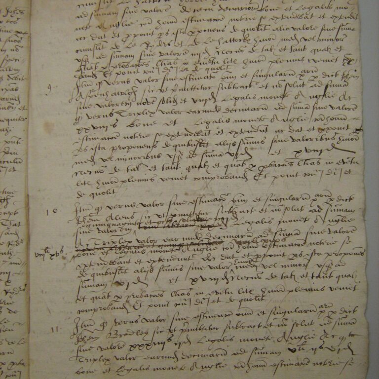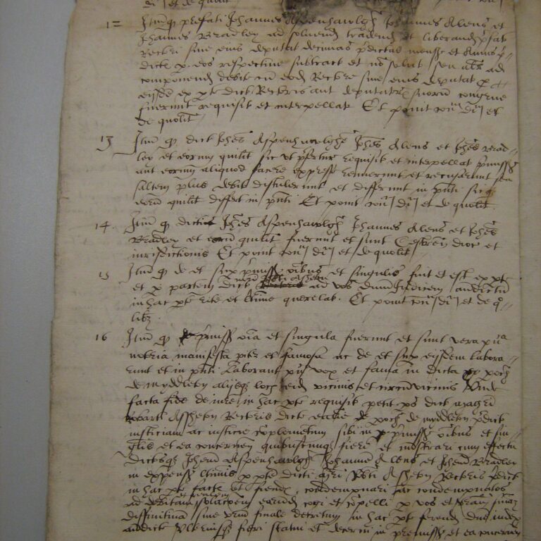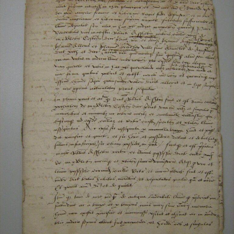 […] occupied […] or fields belonging to the said township or hamlet for ten, twenty, 30, forty, 50 and sixty years and before and since and also from the time and throughout time of the beginning or to the contrary of which there exists no memory of man, tithes of whatever grain and crops belonging, proceeding and arising within the surrounding fields or ploughland that they will separate the 9th part and set them out in kind, or at least they should have and should separate and set them out by law or compounded and compensated for the same tithes with the rectors of the same parish church of Middleton for the time being or their deputy or farmer or should have compounded and compensated for the same tithes; and he propounds jointly and severally and concerning any of these points.