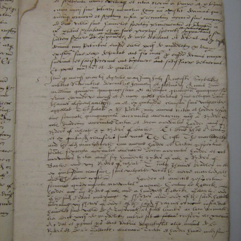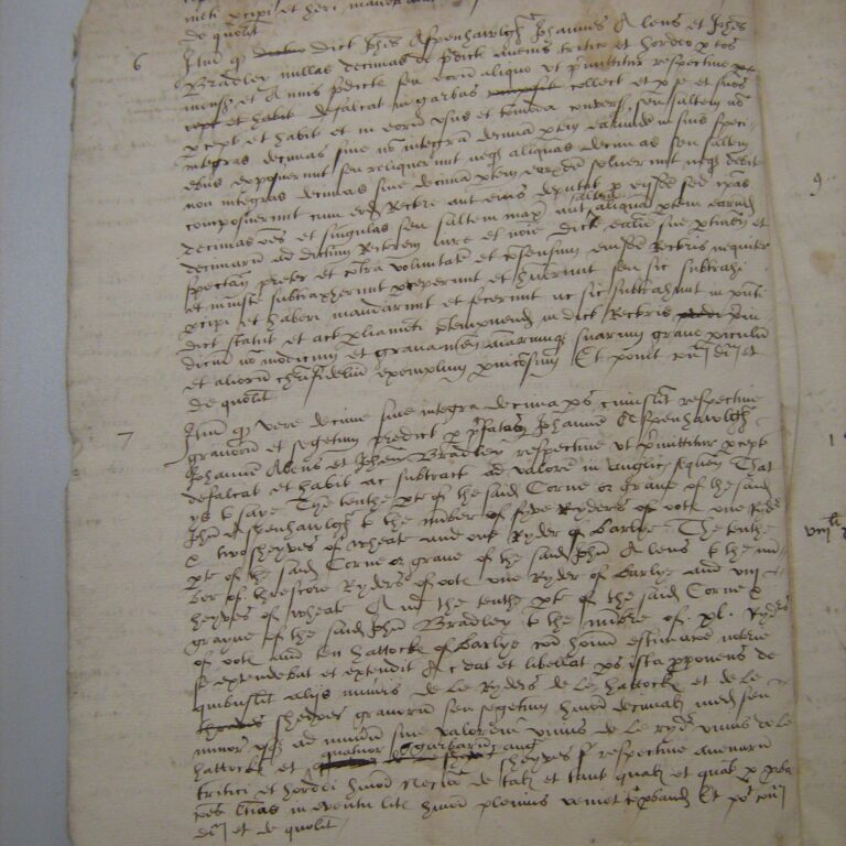5 Also, that in the months of March, April, May, June, July, August, September, October, November, December, January and February in the years of our Lord one thousand five hundred and fifty and one thousand five hundred and fifty-one or in any of those months and years whatever, in several or in the rest, the said John Aspenhawlgh in and from certain of his closes commonly called ‘The Intak & the Park’ sown respectively with oats, wheat and barley had fifty small heaps of oats, in English ‘L Ryders of ootes’, twelve small heaps of wheat and ten small heaps of barley, in English ‘xij Ryders of wheate & x Ryders of barlye’; and the said John Alens in and from certain of his closes called ‘The Crofte The Marledyerthe and the old Marledyerthe’ sown respectively with oats, barley and wheat had sixty small heaps of oats, ten small heaps of barley and eight small heaps of wheat, in English ‘six hunderth ryders of ootes x Ryders of Barlye and viij Ryders of wheat’; and the said John Bradley in and from certain of his closes called ‘the newe marlederth and The barine crofte’ sown respectively with barley and oats had forty small heaps of oats and a hundred ‘hattockes’ of oats, in English ‘iiijC Ryders of ootes and a hundreth Hattockes of Barlye euery of the said Ryders conteyninge x sheyves and euery of the said hattocks