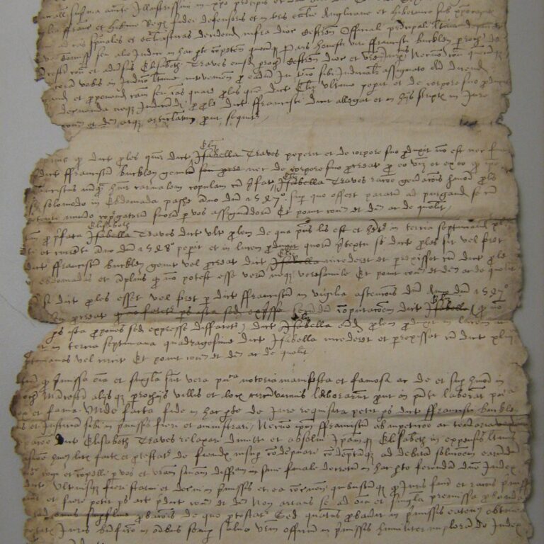 Also, that the aforesaid Elizabeth Traves bore and brought forth into the light the said recent child, about which the present suit is and is had, in the third week of Lent […] and current 1548th year of our Lord, for this reason if the said child might be or might have been […] begotten or fathered by the said Francis Buckley, the said Elizabeth would have given birth and brought forth the said child at […] weeks and more which can neither be true nor likely; and he propounds jointly and severally and of every part thereof.