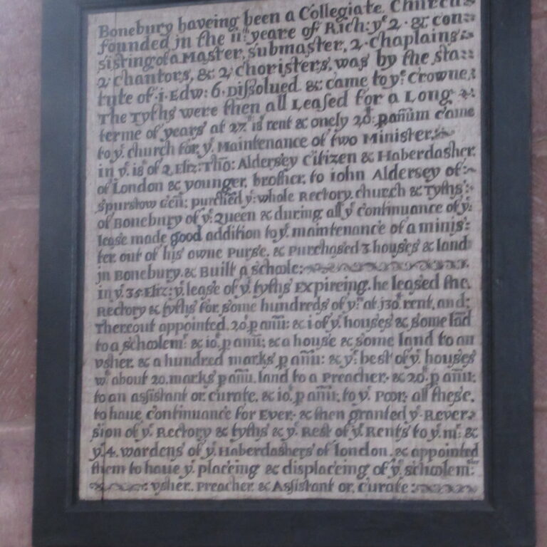 When the college was dissolved in about 1548 it was headed by a dean, with a staff of six chaplains and two ‘conducts’ according to the chantry certificate reproduced by Ormerod. The tithes were then leased for some time but Thomas Aldersey, a Londoner descended from a prominent Chester family, purchased the rectory and the advowson in 1594. He provided for a school and there is still a school in Bunbury which bears the family name. He also endowed a preacher for the parish, to be supported by a curate and appointed the London Company of Haberdashers as trustees. This resulted in the appointment of a series of puritan clergy, leading to conflict with those parishioners who sympathised with religious conservatives.