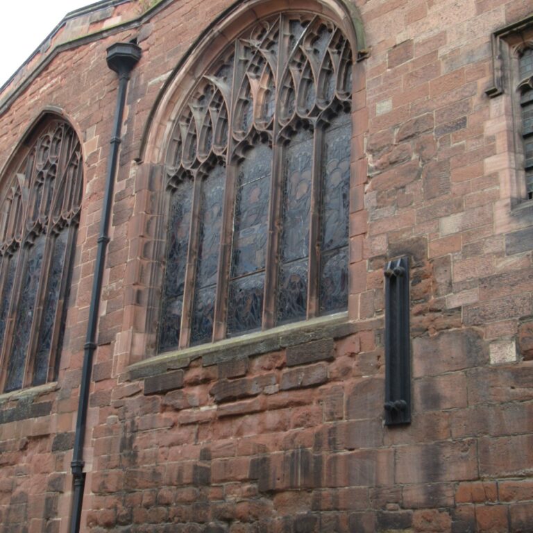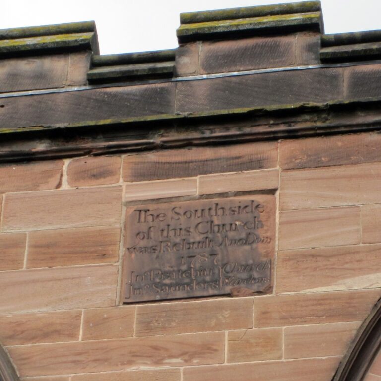 The church building, of red sandstone, is almost square, and underwent a succession of alterations over the centuries, including the removal of the spire. It was originally constructed on the site of the Roman Praetorium and some stone from this was used in the church walls. From the thirteenth century wooden structures adjoined the church on the south side, with shops on the ground floor and the Pentice above. The Pentice building was where the sheriffs’ court met, this had regulated the town’s markets in the medieval period, but its importance had declined by the sixteenth century and the volume of business decreased.