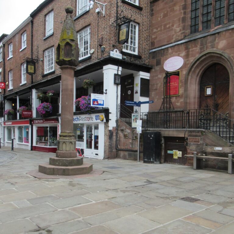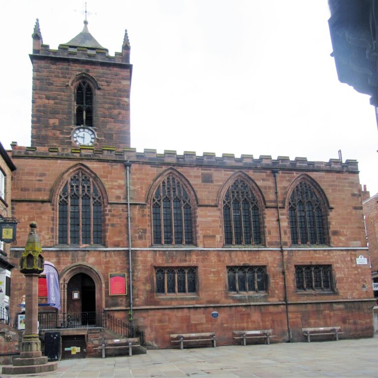 This was one of the nine parishes of the city of Chester. The church building is situated at a central crossroads and the parish always lay entirely within the walls. The remains of the high cross are to be found outside the south door, and the ‘parson’s house’ was situated above the door.