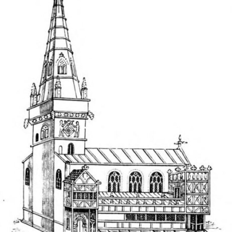 The black and white image of the church in the late seventeenth century is said to be from a drawing by one of the Cheshire antiquarians named Randle Holmes and appears in Ormerod’s History of Cheshire (volume 1, p. 324). It is reproduced courtesy of Hathi Trust. In the image the wooden buildings attached to the church can be clearly seen. The spire was taken down about 1780.