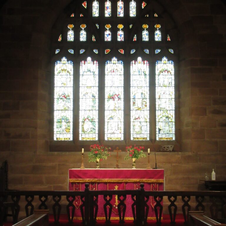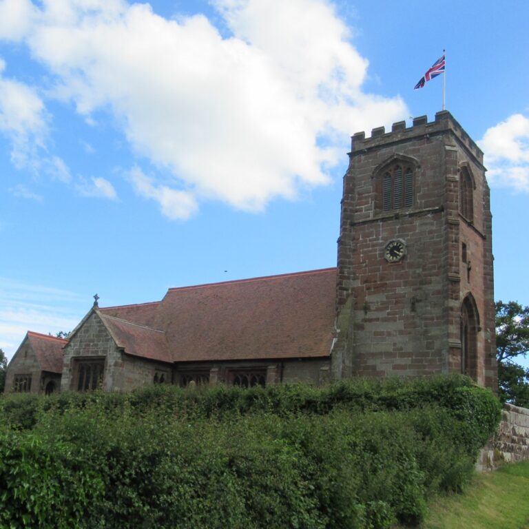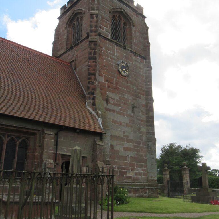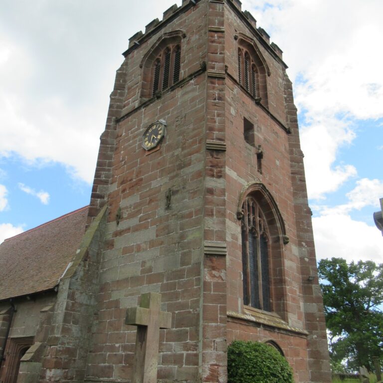 The parish church, built of red sandstone, is situated to the south of the village of Tilston, a short distance from the village. The oldest part of the building is the tower, dating from the fifteenth century which retains its original gargoyles. There was an earlier building on the site of which nothing now remains. Within the church a chapel appropriated to Stretton Hall dates from 1659 and is situated on the north side of the building. There was a major restoration of the church by John Douglas in the nineteenth century in the course of which most of the church was rebuilt.