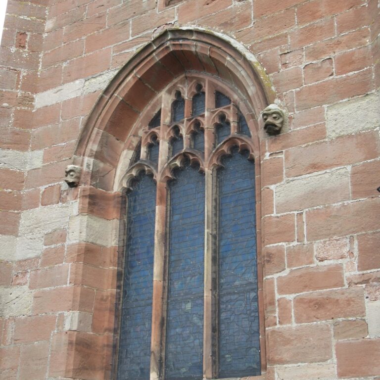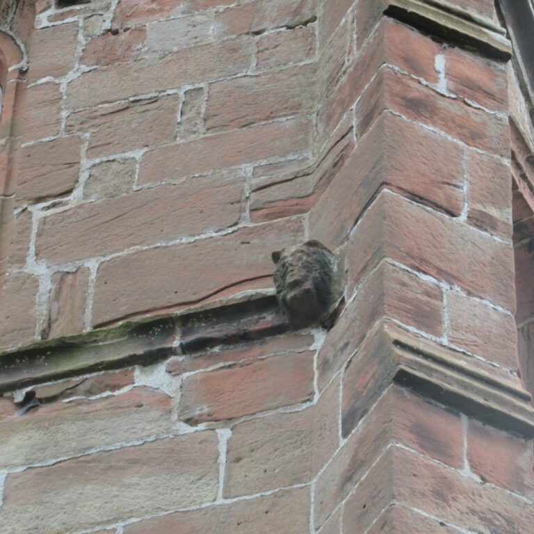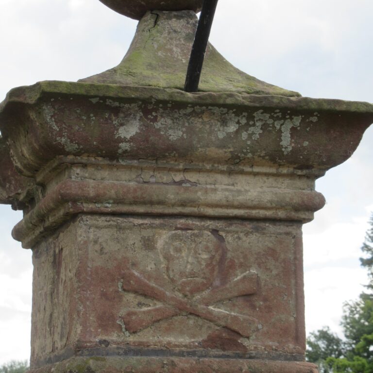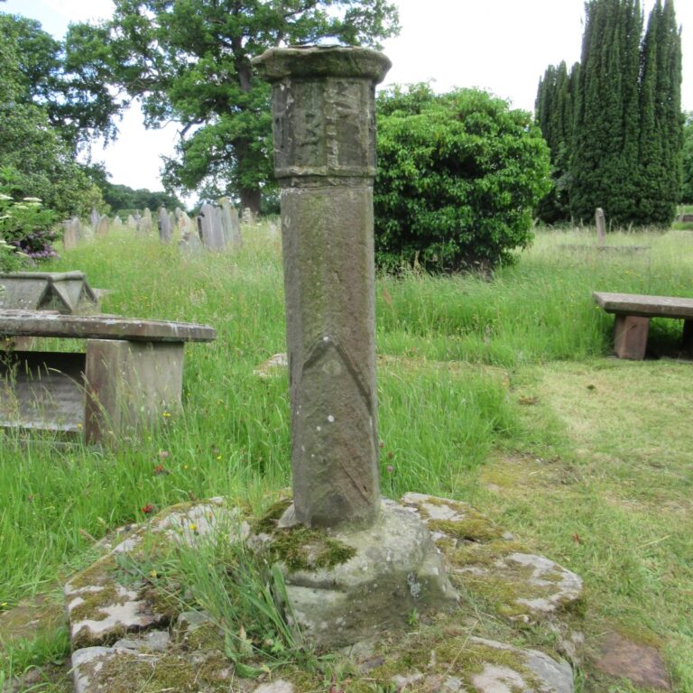 Outside the church, the gate piers in sandstone feature skull and crossbones and the date 1688 is inscribed to the right. There is the base of a medieval cross in the churchyard, which had been altered to incorporate a sundial.