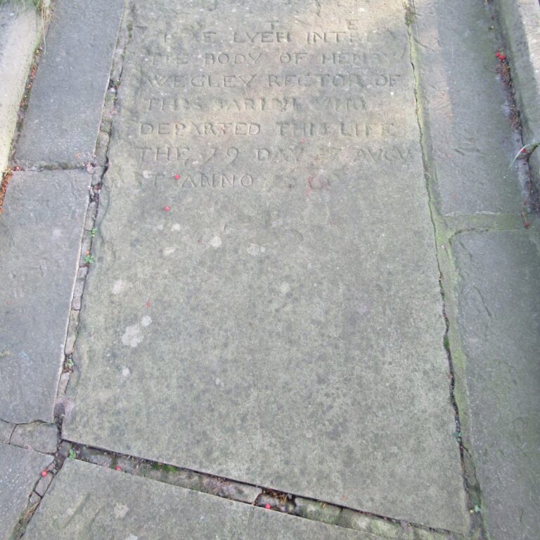 The advowson belonged to the owner of the manor of Warmingham which passed to the earls of Oxford at the end of the fifteenth century and was then sold to Sir Christopher Hatton in 1580. The gravestone of Henry Wegley (or Wigley), the rector instituted to the parish in 1654 and died in 1680 may still be seen set into a path around the church.
